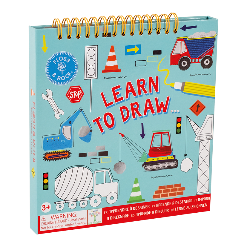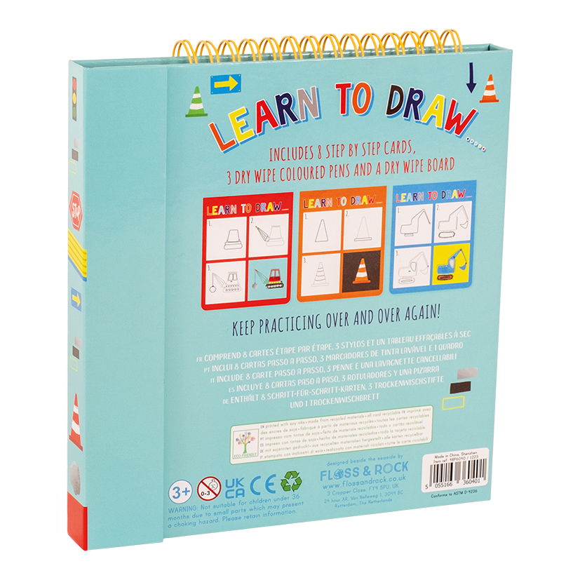 Become a budding artist with our Construction themed Learn to Draw activity. Open the book to reveal 8 thick glossy pages, 3 colour dry wipe pens with erasers and a draw and colour section to copy the image. Each page has a 3 step guide as to how to draw your masterpiece! The book folds almost flat with a magnetic closure and is perfect for travel and taking out and about. Reusable over and over again.