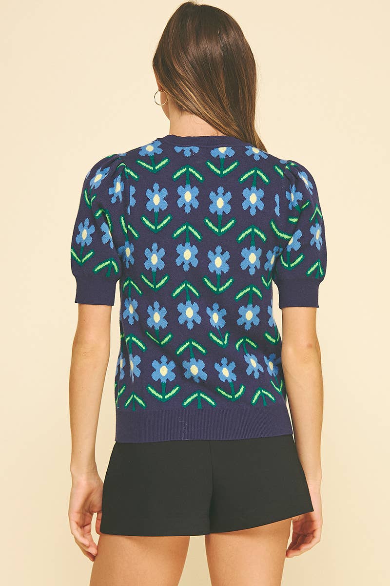 ROUND NECK BALLOON SHORT SLEEVE FLORAL PRINT MODEL WEARS A SIZE SMALL